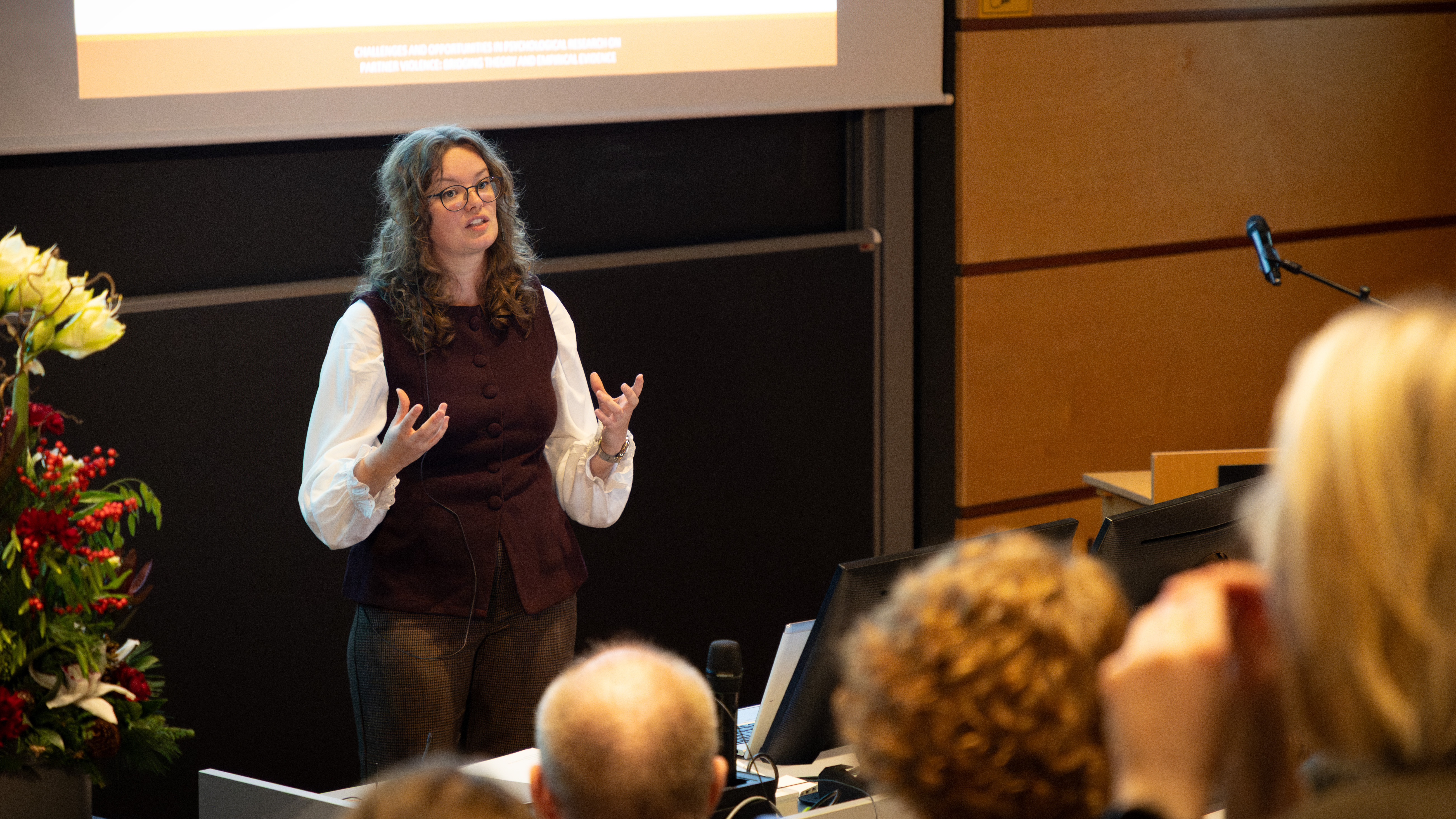 Prøveforelesinga i forkant av disputasen hadde temaet «Challenges and Opportunities in Psychological Research on Partner Violence: Bridging Theory and Empirical Evidence» (utfordringar og moglegheiter i psykologisk forsking på partnarvald: brubygging mellom teori og empiriske funn).