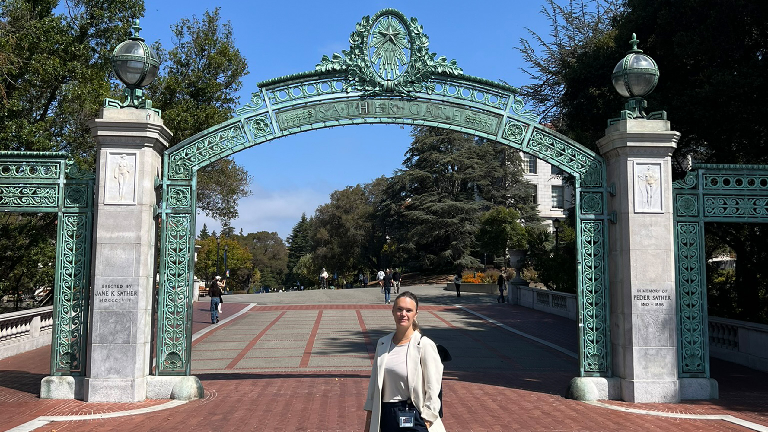 Annette Gjerde-Hansen ved ikoniske Sather Gate utenfor UC Berkeley. Foto: privat.