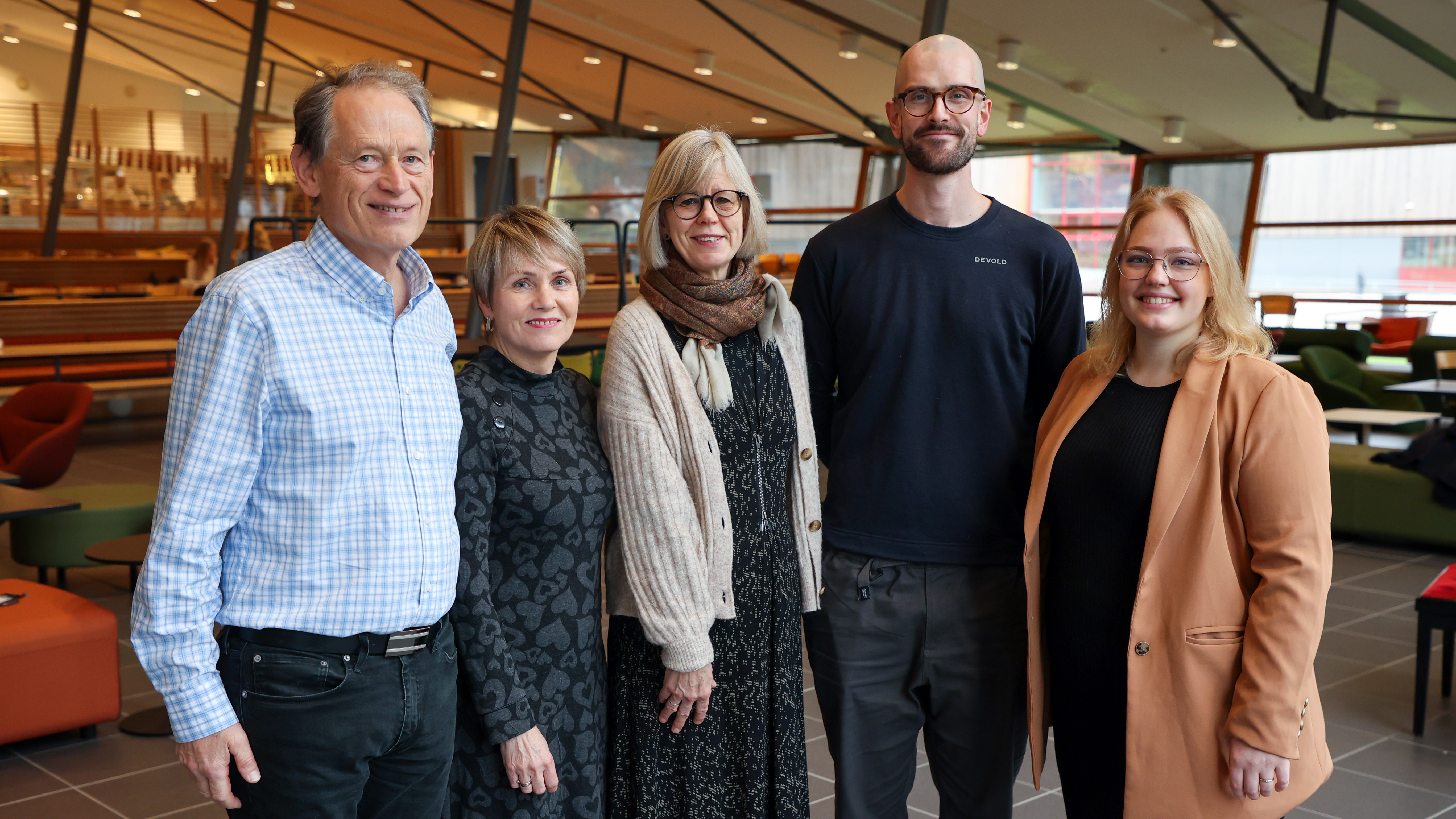 Frå venstre: professor Per Halse, leiar for doktorgradsprogrammet, professor Siv M. Gamlem, emneansvarleg for ph.d.-kurset om forskingsmetodar, professor Inger Marie Okkenhaug, som er mellom faglærarane på kurset, og stipendiatane Sondre Johan Chesney Kvamme og Rebecca Linnèa Söderström Barreng, som er del av det første forskarkullet på ph.d.-programmet «Utdanning, språk og kultur». Foto: HVO / Steinarr Sommerset.