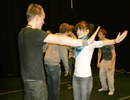 Den andre gruppa har valt musikk, dans og drama. På slutten av dagen fekk dei treffe dramastudentar og delta i teatersport. Samlinga fant stad i teatersalen, der dramastudentane hadde laga eit opplegg med fleire ulike aktivitetar. Først ut var ei oppvarmingsrunde for å engasjere og lausrive elevane. Elevane skulle då følgje instruksar frå dramastudentane som ”Tre nasar mot kvarandre”. Deretter var det tautrekking utan tau, spegelbilete-dramatisering, sirkeldramatisering og stolleik. Latteren satt laust i lokalet, og både elevar og studentar såg ut til å finne tonen.