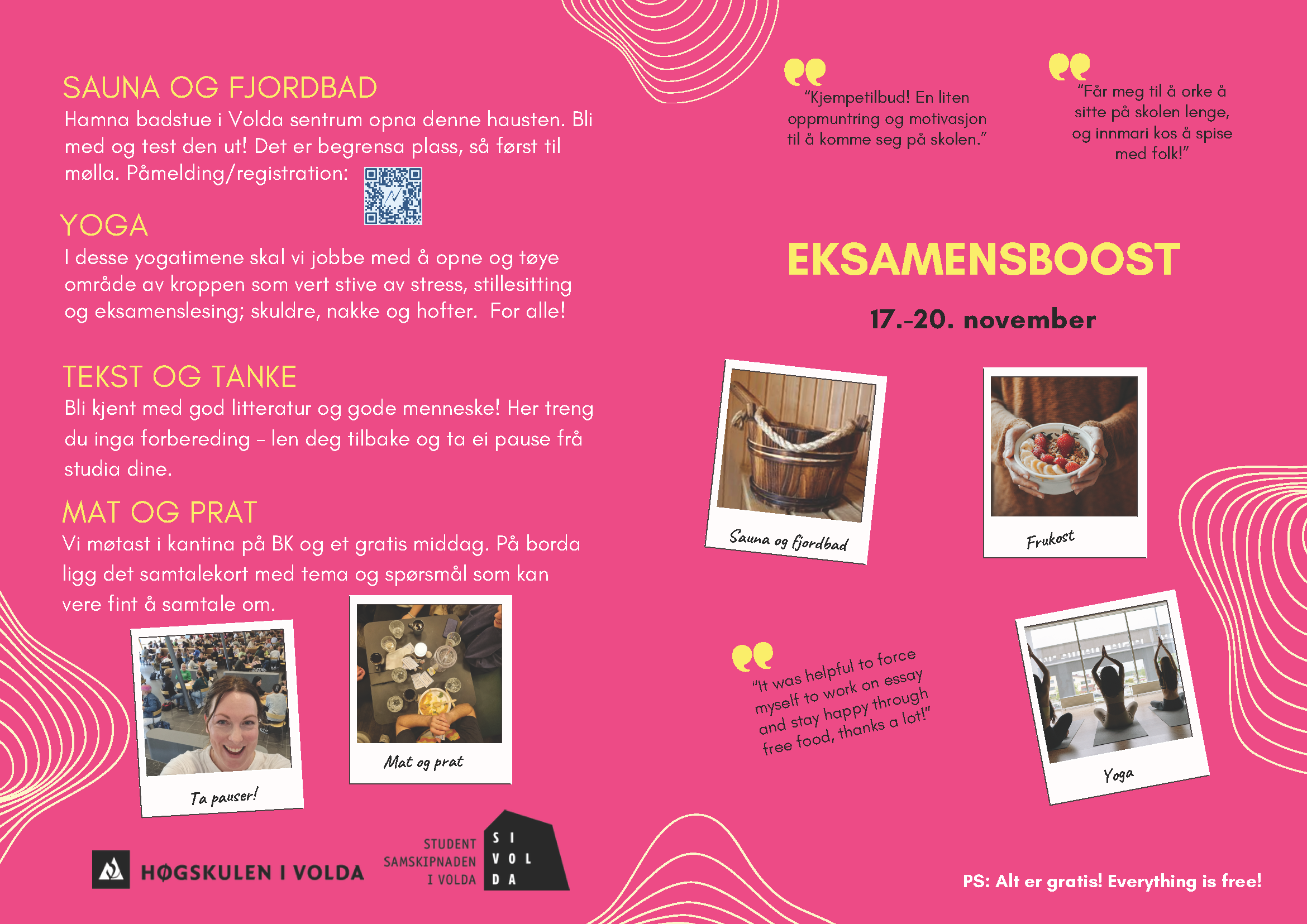 Eksamensboost 17.–20. novemberVelkommen til eksamensboost fra 17. til 20. november, og få det påfyllet DU trenger i eksamensperioden. | Welcome to the exam boost from November 17th to 20th, and get the refill YOU need during the exam period. Lenke til å booke samtale. Påmelding til fjordsauna. Del på: