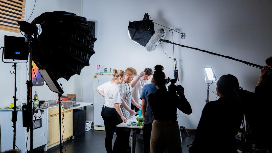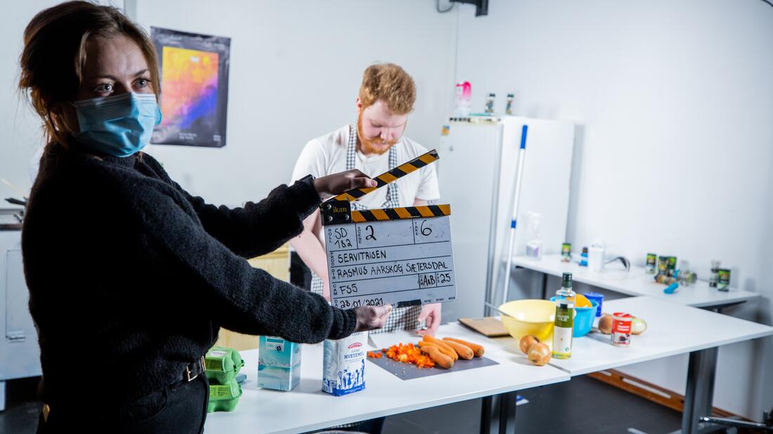 Like over gangen, i Stanislavskijsalen, samarbeider andreklassingene på teater og drama med studenter fra Bachelor i medieproduksjon på innspilling av korte scener fra kjente filmer – dramastudentene foran kamera og mediestudentene bak kamera. Gruppene er små, munnbind er påbudt og produksjonsrollen «smittevernansvarlig» er en ny jobb i årets øvelse.