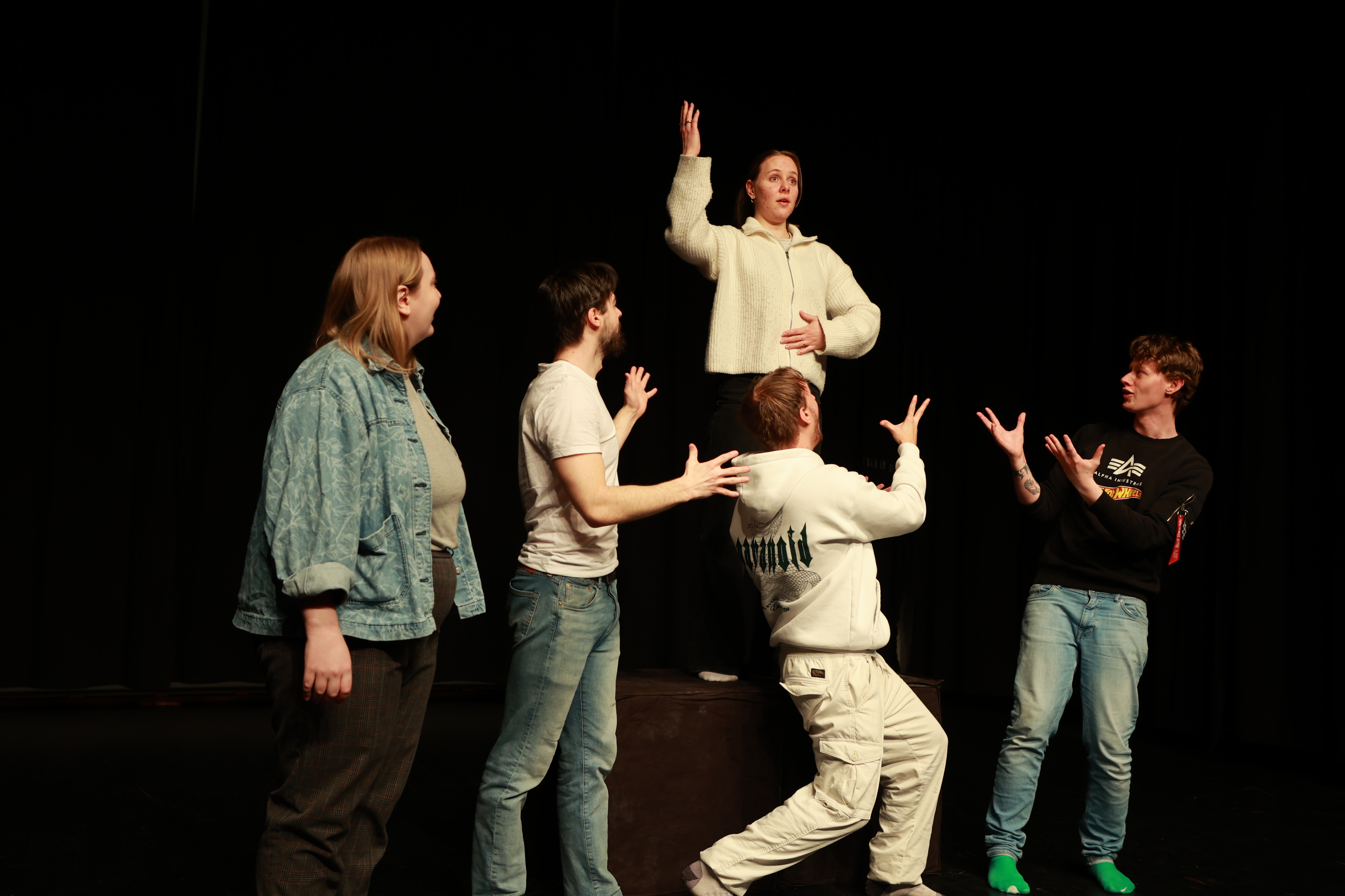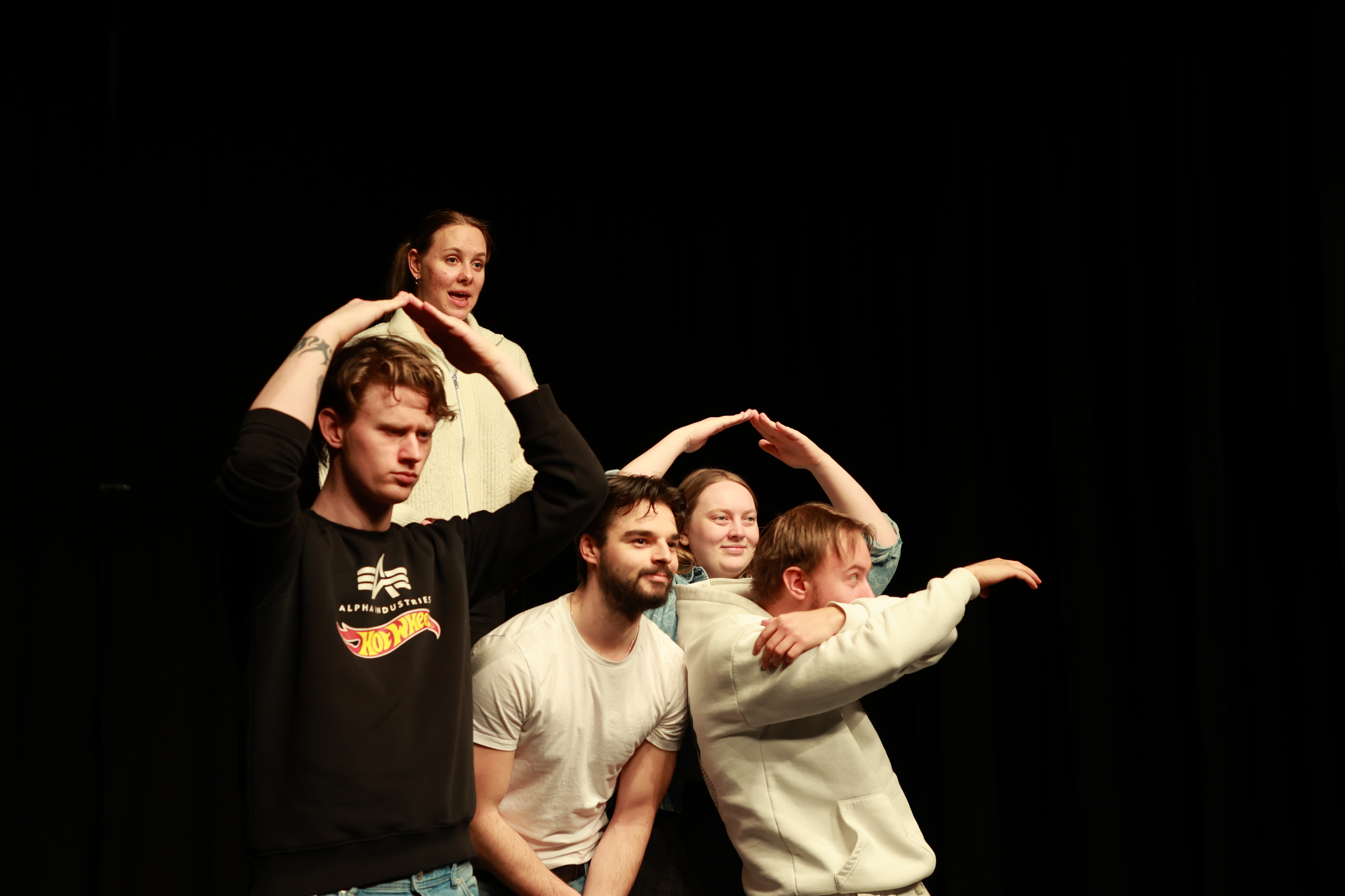 – Det er utrolig spennende, og mye jobb som ligger bak. Vi har kommet opp med og forkastet mange ulike ideer, og videreutviklet den fortellingen vi viser fram under hele den uka vi har hatt til rådighet. Det er noe annet å spille skuespill for sjetteklassinger enn voksne. Vi må finne noe som fenger disse unge ungdommene, legge inn noen småstopp, få med litt humor – ja, det er en ganske annen måte å lage teater på, synes Ragnhild Moen, Verner Emil Flister, Maria Norbeck, Niklas Olai Hagali og Julian Rønnevig.