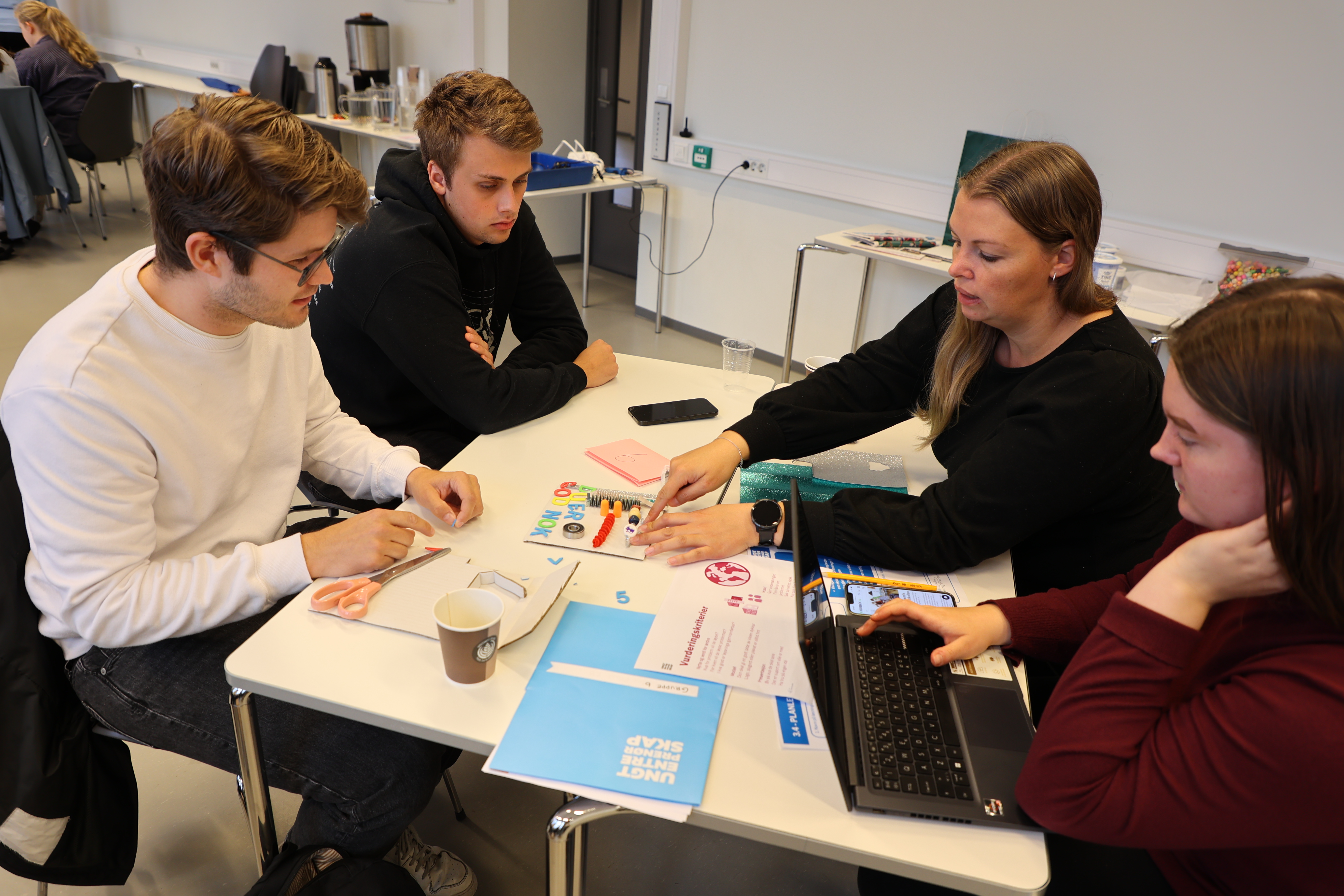 Rundt eit gruppebord finn vi Helga Grønnevik, Linn Amalie Iversen, Magnus Helland og Kevin Pettersen, saman med pipereinsarar, små, fargerike skumgummibokstavar, eit lite magnethjul, nokre treperlar og anna som høyrer med i ein kreativ prosess.
