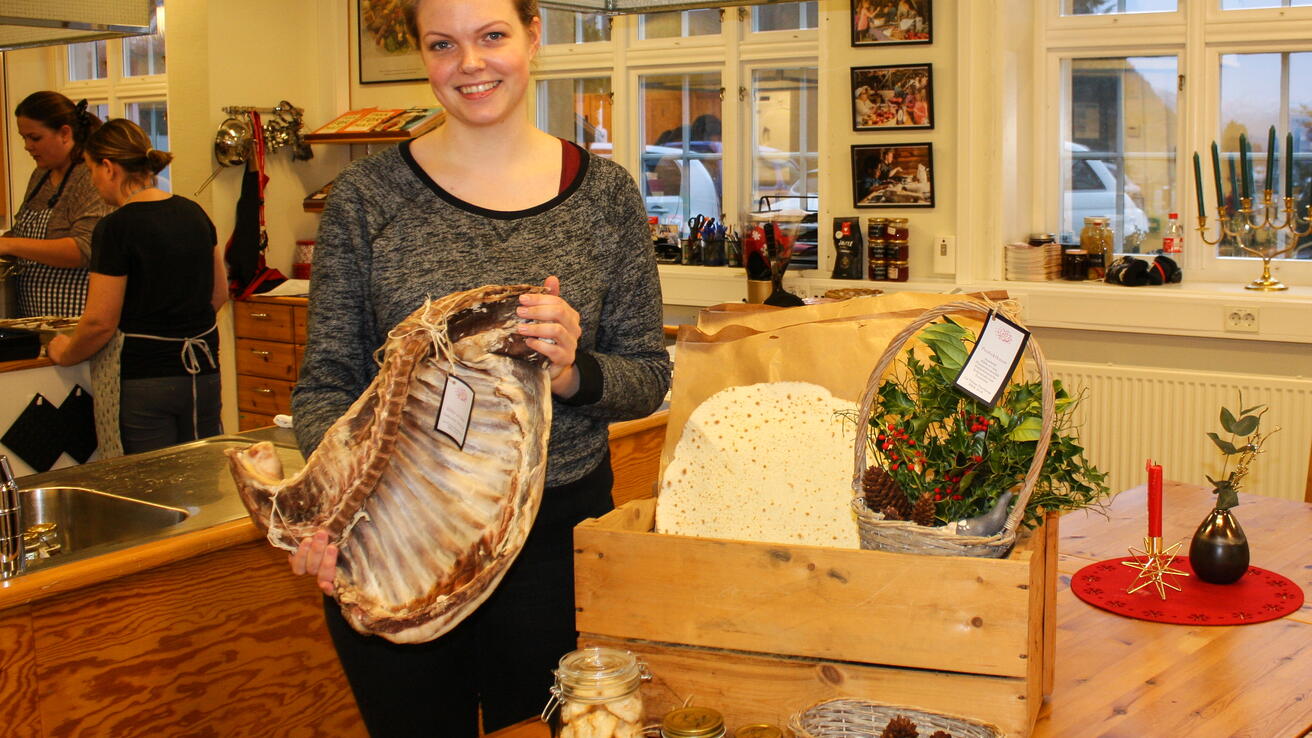 Liz Torine Enerhaug viser fram lefse, pinnekjøt med nakke, hermetiske plommer, stikkelsbærsyltetøy og kokosmakronar som ho har laga i studiet Mat, kultur og konservering.