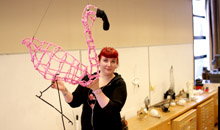 Kunst og handverksstudent Nadia Kristiansenvelde å lage ein flamingo av ståltråd, garn, knappar, kleshengarar og ein sokk.