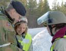 Journaliststudent Anne Natvig (t.v) intervjuer en offiser frå dei mulitnasjonale styrkane som skal presse ut dei mazziratiske styrkane som har trengt inn i det fiktive landet Olivia.