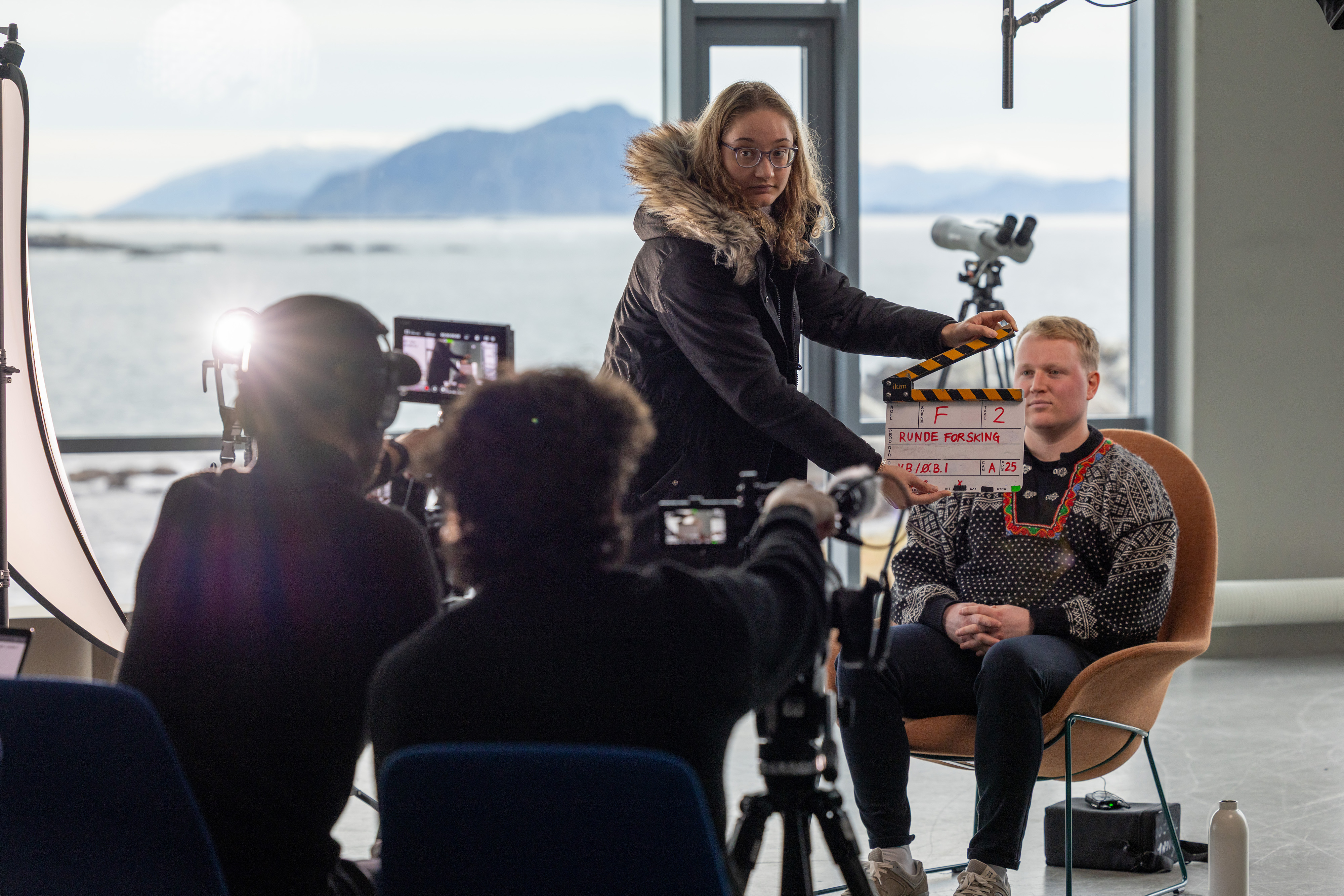 Veronika Teresa Blazejewski marks the take with a clapper. Researcher Ørjan Sørstrønen Vabø is ready for the interview. Vegard Sander Billing and Øyvind Bach Igland are behind the camera. Photo: Dag S. Roland.