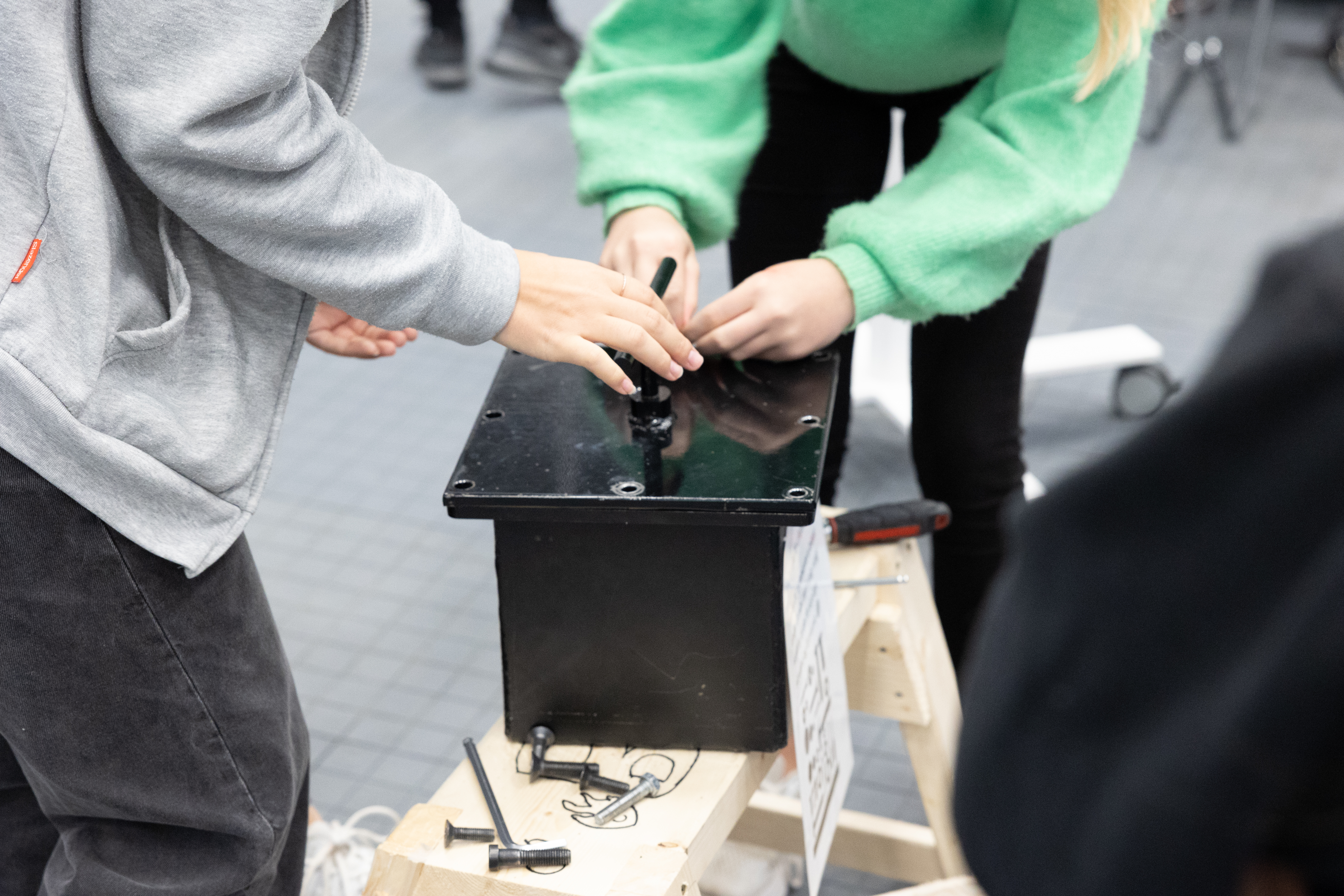 På området til bygg- og anleggsteknikk stod en annen ivrig ungdom og slo spiker ned i en trebjelke. Emily Victoria (15) likte håndverkernes stand veldig godt og ble beskrevet som et naturtalent av de rekrutteringsansvarlige.