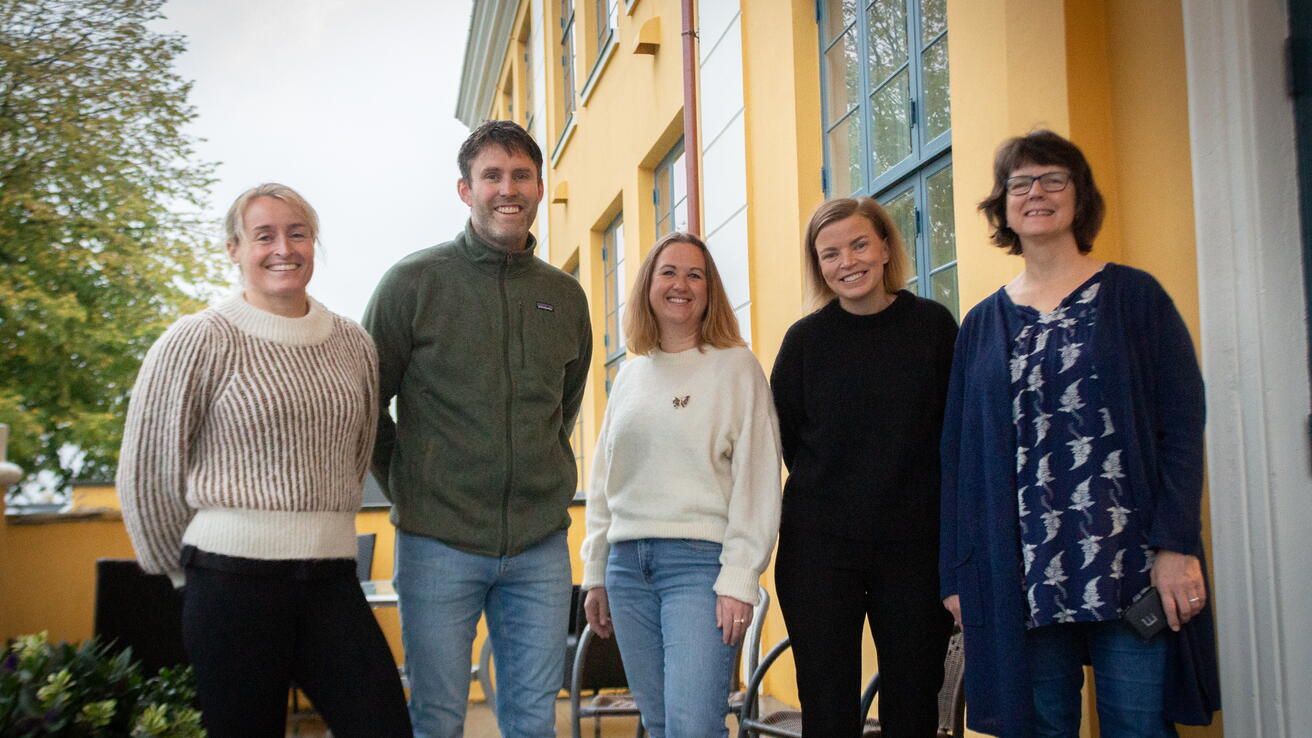 Fantastisk kjekt at vi har fått denne tildelinga, dette gleder vi oss til. Vi ynskjer alle lærarar velkomne til studiestaden Volda, seier høgskulelektor Elisabeth Innselset (f.v.), her saman med studieprogramleiar Tore Sørheim, prosjektleiar Mari Lome, studieprogramleiar Janne Heggvoll og instituttleiar Elizabeth Oltedal.