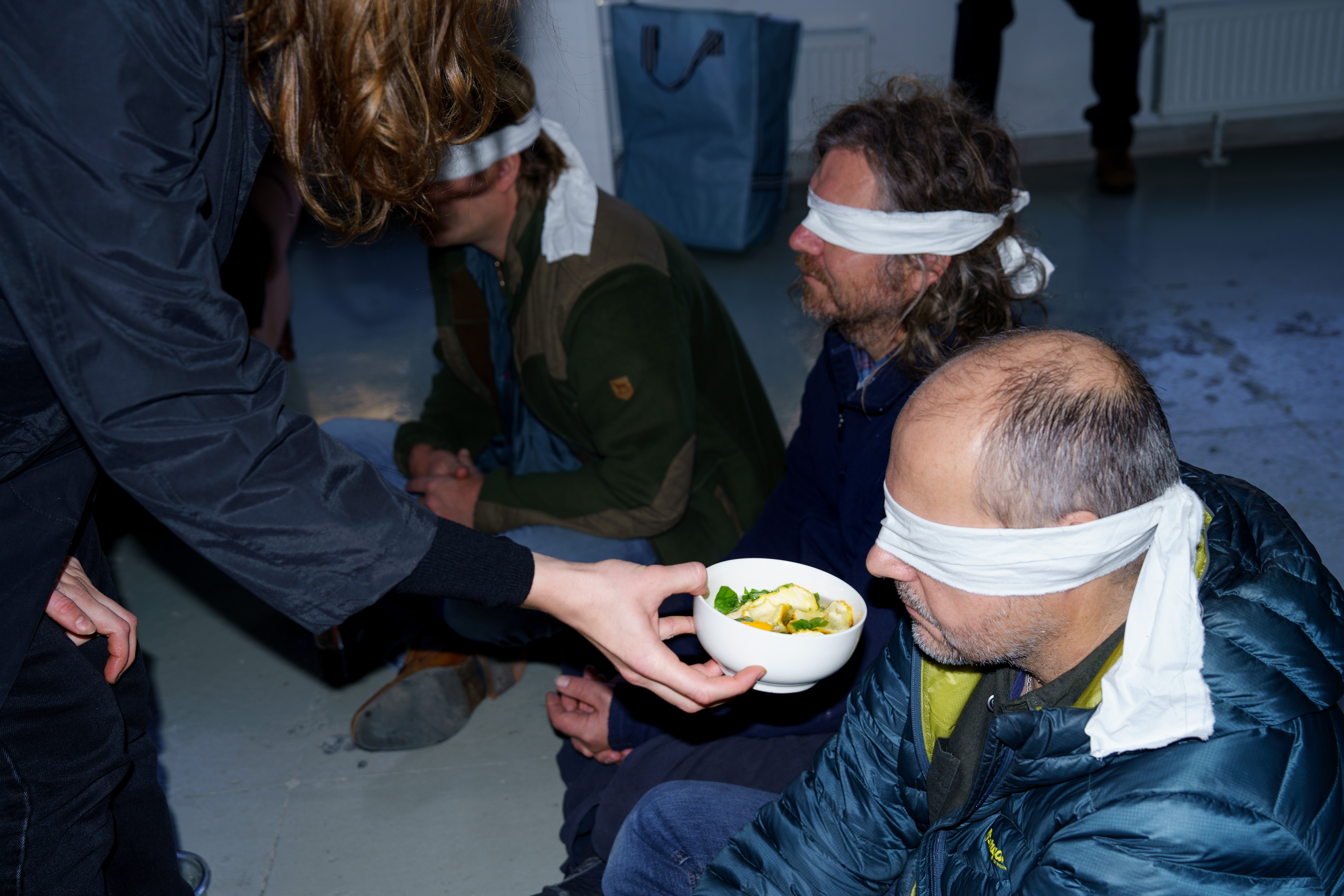 HVO-professor Erik Fooladi (t.h.) får utfordra sanseapparatet på lukt-kunstfestival i Riga. Her i luktkomposisjonen til den norske komponisten Ola Ur Sæbø. Foto: Niklavs Kadikis.