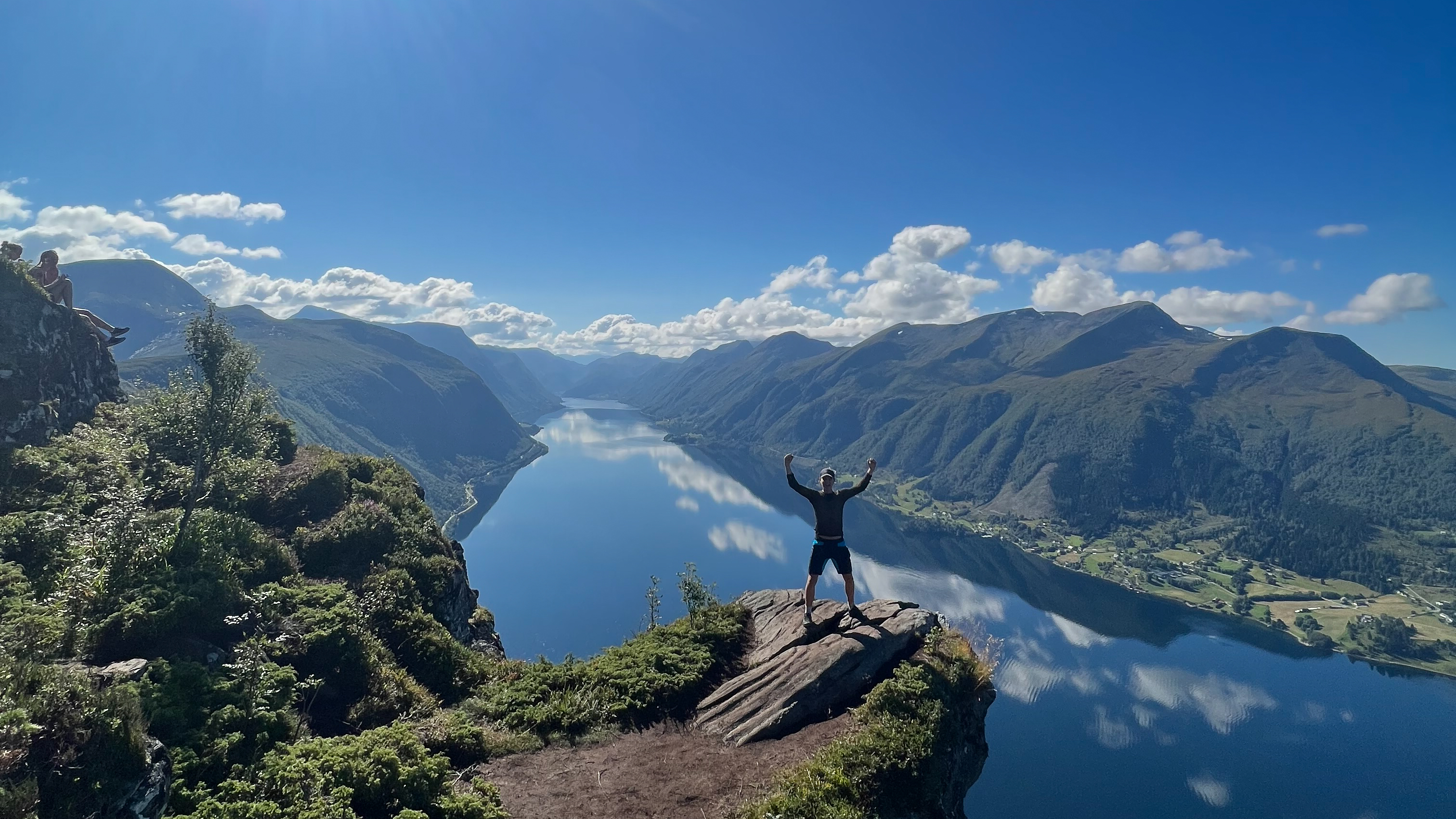 Oscar Lunde på utkikkspunktet Galten, med Dalsfjorden i bakgrunnen. Foto: Privat