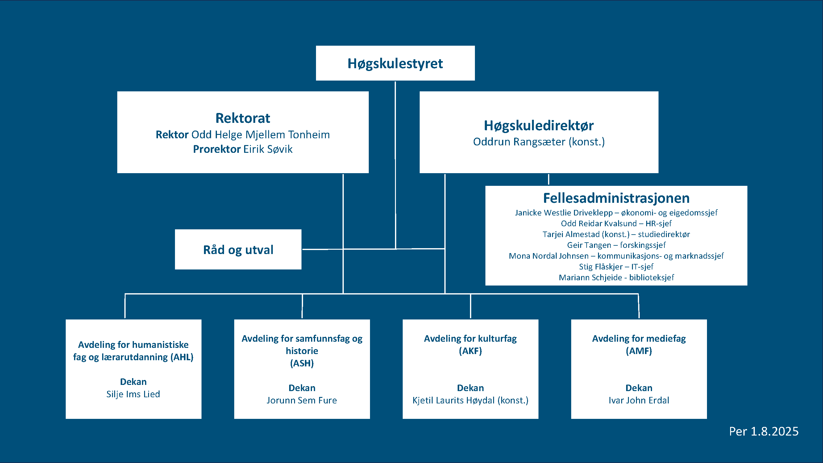 Universitets- og høgskulelova har to ulike alternativ for organisering av leiinga ved institusjonane, med anten valt eller fast tilsett rektor. Høgskulen i Volda har valt å ha ei todelt leiing med valt rektor. I denne organiseringa har rektor overordna ansvar for det faglege arbeidet. Rektor er også styrets leiar. Høgskuledirektør har som administrerande direktør/dagleg leiar ved institusjonen ansvar for den samla administrative verksemda.