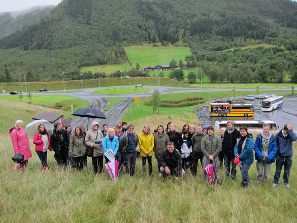 OVERBLIKK. Studentane og førelesarane ovanfor tunnelinnslaget i Morkaåstunellen der dei får overblikk over planområdet på andre sida av dalen.