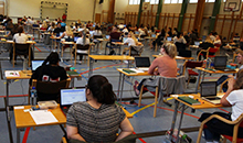 77 studentar hadde tysdag digital eksamen i Idrettsbygget med eigen berbar datamaskin.
