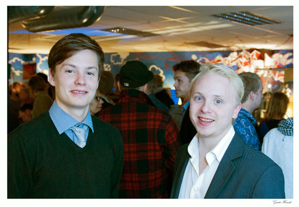 Regisørane Ola Nielsen og Kristian Haukland vann sin førstepris for beste industrianimasjon. Her under ei kunstutstilling i høve animasjonsfestivalen etter prisutdelinga. Foto: Gaute Hareide, Høgskulen i Volda.