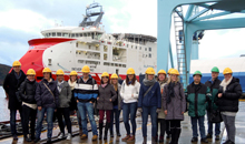 AVANSERTE FARTØY: Studentene og de tilsette framfor et av ULSTEIN sitt avanserte fartøy Seven Viking som skal leverest til rederiet Subsea 7. Foto: Nathalie Homlong